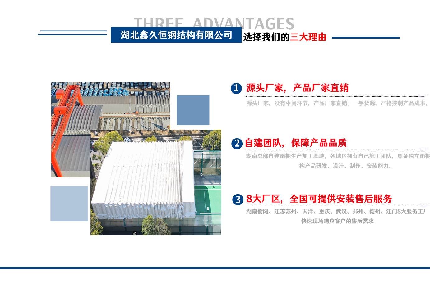 湖北鑫久恒鋼結構有限公司是一家電動雨棚、膜結構車棚研發,生產銷售,施工安裝于一體的專業鋼結構科技公司,主要產品有伸縮雨棚,電動雨棚,膜結構車棚等。  湖南地區職員目前有80多人,占地面積20000平方米,廠房面積15600平方米,配備先進的生產流水線,使每件品質產品的堅實基礎?! 」驹谔K州、天津、重慶、武漢、德州、烏魯木齊、江門均設有服務工廠,總人員共300多人,擁有專業的技術團隊,配備先進的設備和流水線生產,產能高,貨源充足,發貨速度快,服務區域廣?! ∫苿由炜s棚適用于通道臨時倉儲、戶外運動遮陽、污水池遮蓋、能源交通、熱力化工、礦山、船舶制造及市政建設、物流、碼頭等領域的構件制作加工,成品半成品存放、倉庫、野外儀器設備操作用房等。尤其是對工廠發貨、倉儲臨時遮雨防嗮,梅雨期較長、建設周期較短的工程施工等特別適用。還可根據用戶需求量身定制、適合企業所需不同款式的產品。  我公司堅持“誠信社會為本,客戶滿意為榮”的經營理念,做到質量把控,嚴格管理,精益求精,恪守承諾。使鑫久恒逐步走向成熟,其系統化、專業化日趨完善。以專業的技術、科學的管理,更高的產品質量,優良的企業信譽,真誠的客戶服務,靈活多樣的經營方式和務實創新的企業精神愿與社會各界攜手合作,為推動智能鋼結構建筑事業的發展而不斷努力。...